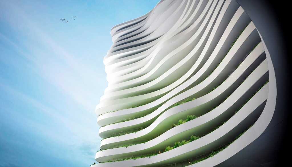 The building’s curved design embraces the area and the lively shaped balconies opens up the structure towards the surroundings thus raising the park up in the air. The dense city structure at the base adds activity at eye level and life thrives on active roof tops and flowering balconies.