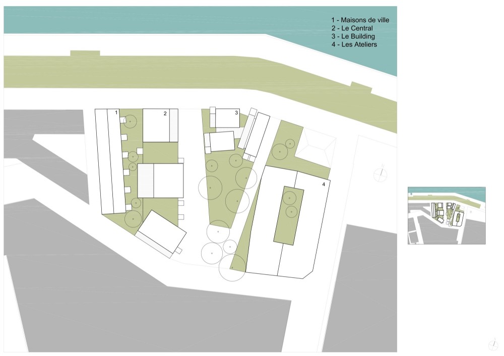 Architect Fabrice Dusapin came up with a project that complements diversity of urban “quai” of François Mitterrand. “Quai” is a french word for docks. Project, located on the banks of Loire river in the french city of Nantes, has very different building heights and volumetric comparing to an existing renewed house and a new residential building. Located on a large parcel, the project offers a space with an alley and access to the Loire river. This project is composed from four parts: maison de ville, ateliers, centre and building itself that fits around a square that represents heart of the area. Residents of apartments have a fabulous view at the river and take advantage of natural lighting. The yard catches eye at first sight; various shapes like some very different buildings glued together. The conglutination reflects on functionality of these buildings – the yard is poly-functional. It houses residential parts as well as shops, parking slots, small square or halls for local activities.