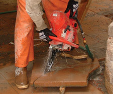 A concrete saw is a power tool, that is made for cutting concrete, masonry, brick, asphalt, tile and other solid materials. The concrete saws are powered by gasoline, hydraulic or pneumatic pressure or electric motors. The significant friction generated in cutting hard substances like concrete usually requires the blades to be cooled to prolong their life and reduce dust. Blades are either abrasive or diamond tipped. These concrete saws can be either hand-held, mounted on a stand, or wheeled by hand or motor.